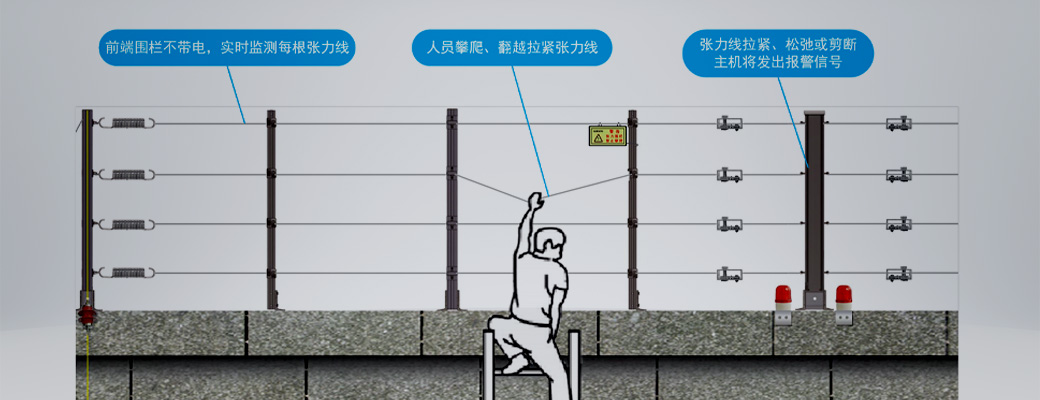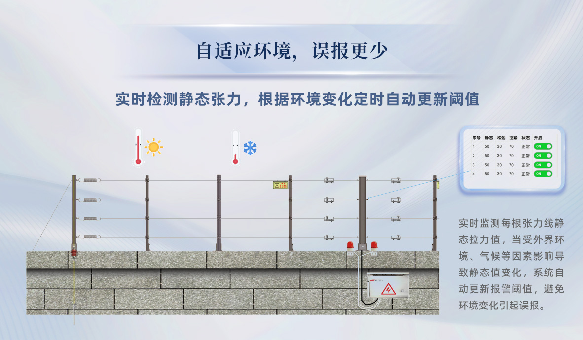张力式电子围栏是一种防止攀爬、翻越的物理围栏,通过感知前端攀爬、剪断、破坏围栏入侵的装置,对入侵者进行震慑,达到安全防范的目的。 1、构成实体屏障,防止人员攀爬或穿越;2、通过检测钢丝绳的张力变化来感知入侵行为;3、系统能够自动调整,以适应环境变化,减少误报