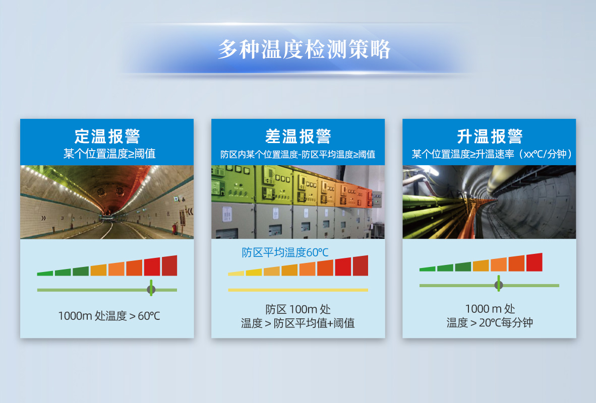 DTS定位型测温光纤系统基于拉曼散射(RAMAN)和光时域反射(OTDR)原理,通过对后向拉曼散射光信号强度进行处理和对比计算出温度分布曲线,,同时结合光的传输速度和回波时间实现温度点定位。具备信号采集、信号处理、数据分析、分区设置、报警值设定等功能,具有高精度和高空间分辨率等优势。