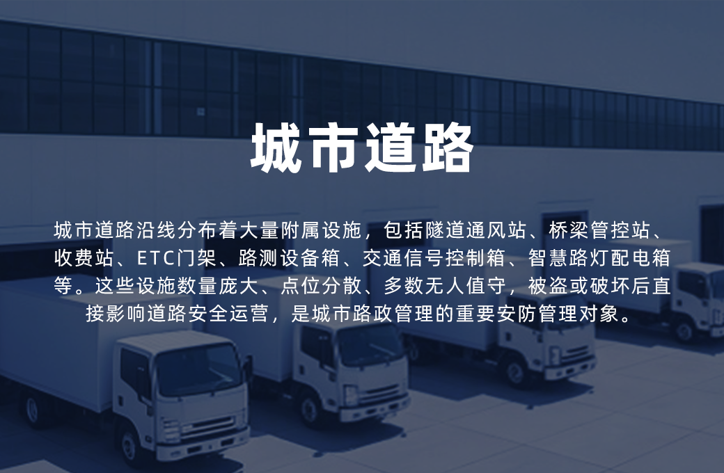 1. 铜缆及蓄电池盗窃高发:城市道路附属设施内的铜芯电缆、蓄电池是最主要的盗窃目标。收费站、ETC门架的供电和通信铜缆被盗后设备停运,修复成本高;路灯、信号灯配电箱铜缆被盗则直接引发夜间道路黑暗和信号失控,严重威胁行车安全。 2. 设施数量庞大统一管理困难:仅一个中等规模城市,各类道路附属设施站点数量可达数千个,分散于全市各条道路。传统人工巡检成本极高,巡检周期长,被盗后往往在下次巡检或故障时才被发现,损失早已造成。 3. 施工围挡区域临时防护难:城市道路施工围挡区域材料、设备被盗事件频发。现场环境复杂,临时安防系统的快速部署和灵活移动是主要挑战,传统固定安装式安防设备无法适应频繁移位的施工场景需求。 4. 不同部门管辖协调成本高:高速公路、市政道路、桥梁隧道分属不同部门管辖,各部门安防系统各自为政,联合巡查、统一处置的协调成本高,部门间信息无法共享,形成明显的管理壁垒。