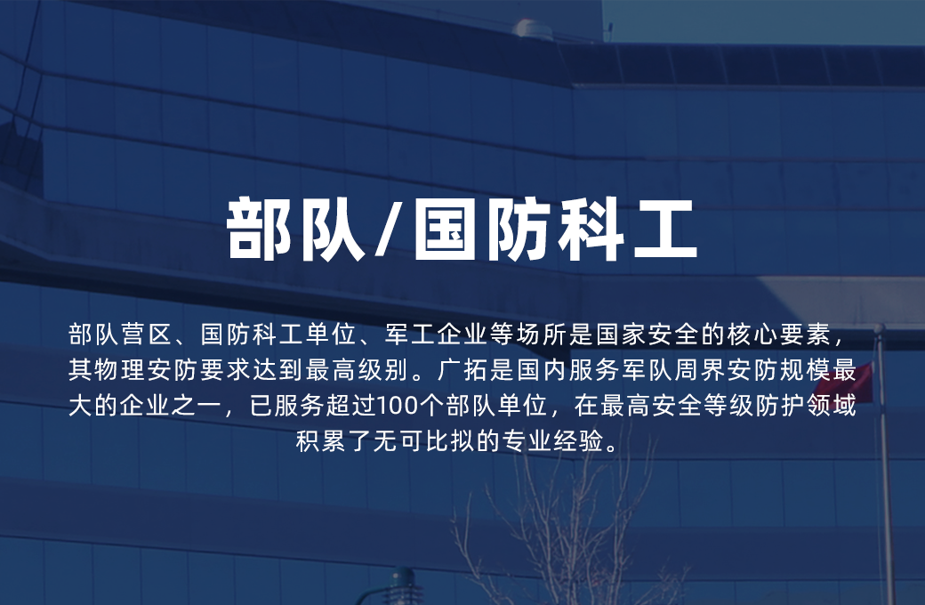 广拓针对国防军工场所的最高安全等级需求,提供军用级可靠性的周界安防方案,以绝对可靠、抗系统攻击、完全本地化为三大核心设计原则。 营区围界核心防护采用六线制触网防旁路脉冲电子围栏,这是广拓自主研发的最高安全等级产品。六线制系统相较于行业常见的四线制,增加了独立的旁路检测线和短路检测线,实现触网报警(有人接触围网)、旁路报警(有人用导线短接绕过)、短路报警(有人剪断后短接处理)、断线报警(有人切断线路)四种独立报警模式,从根本上堵死了传统围栏的所有技术漏洞,让专业化攻击手段完全失效。 在六线制围栏基础上,全线叠加全频谱振动光纤形成冗余探测体系。两套系统完全独立运行,采用不同传感原理,即便其中一套系统遭到针对性破坏或干扰,另一套系统仍可独立维持完整防护。系统具备完善的线路连续性监测功能,任何传感线路的局部损伤均在10分钟内自动检测并告警,确保防护体系的完整性始终可知可控。 SAM300平台完全本地化部署于营区内网服务器,不依赖任何外部网络或云服务,所有数据存储于本地,满足最严格的保密要求。平台软件自主研发,具备完整的软件著作权,满足国产化采购要求。系统支持与营区综合指挥系统实现内网标准协议对